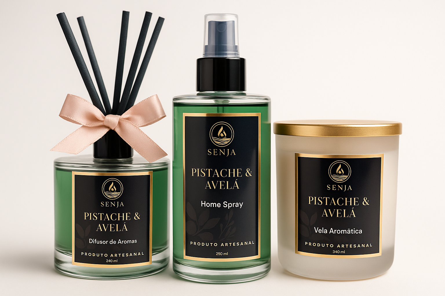 Kit Completo Pistache & Avelã com aroma cremoso e gourmand. Perfeito para criar uma atmosfera doce e aconchegante.